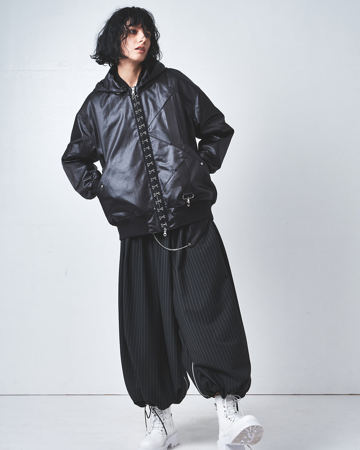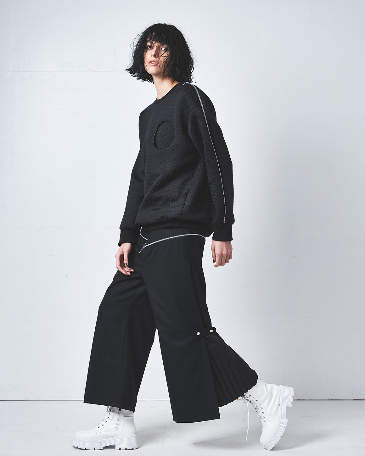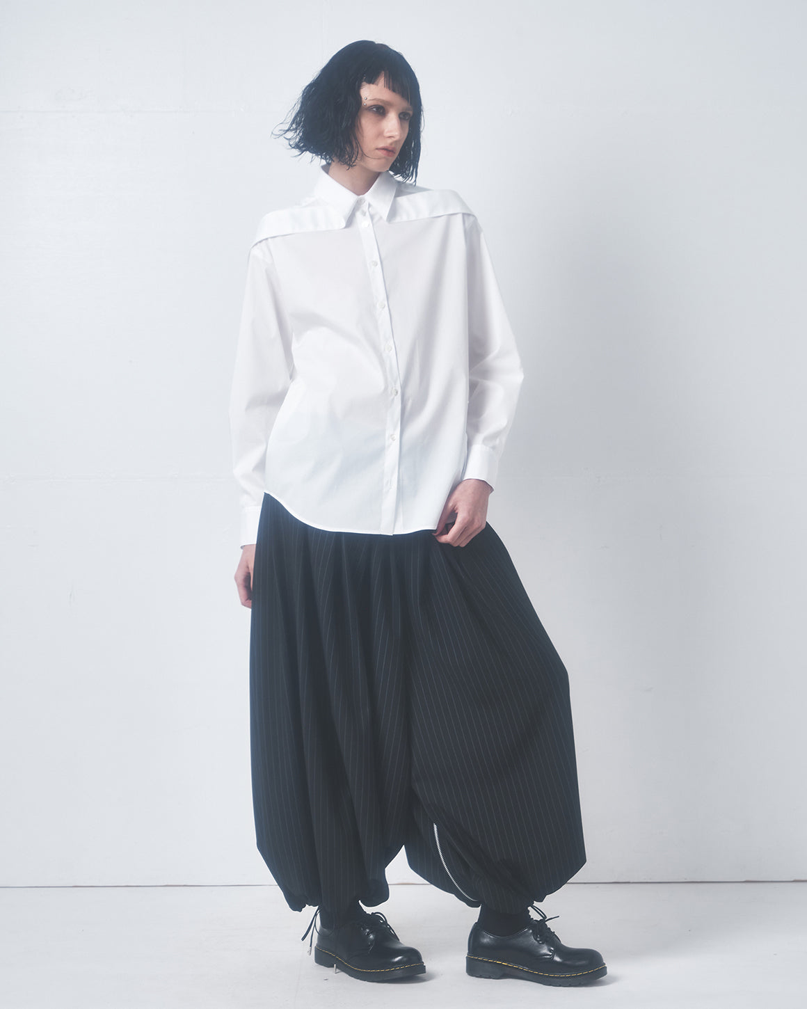 自身のパタンナー出身を活かした、ギミックのあるパターンテクニックを用いたデザインが特徴的で、トランスフォーム(変身)する服をコンセプトとしたレディスウエア、ユニセックスウエア、バッグ、レザーグッズなどを展開。After graduating from a design college, he began his career as a pattern maker.