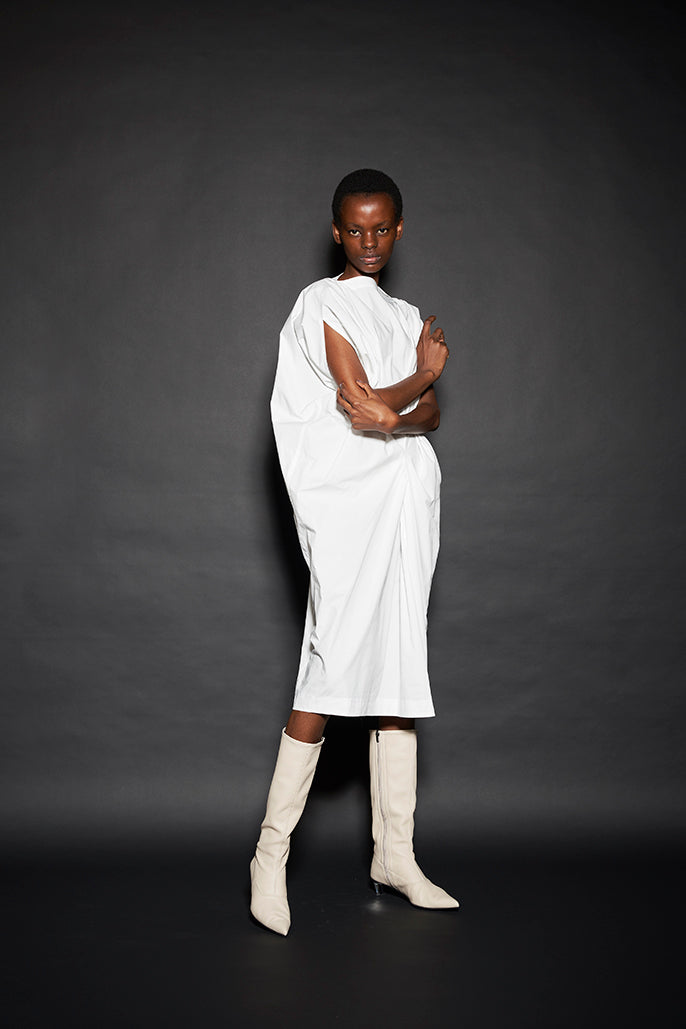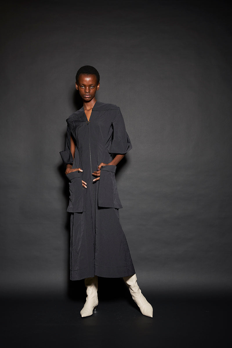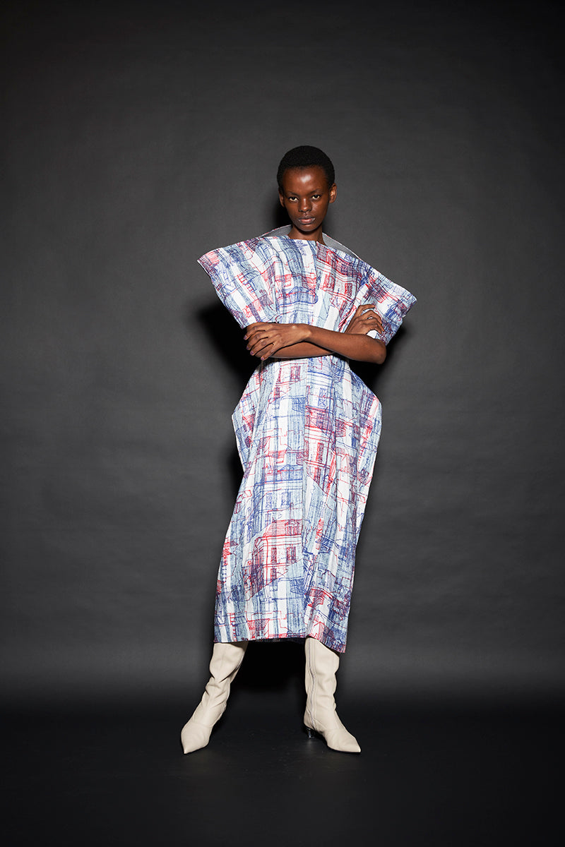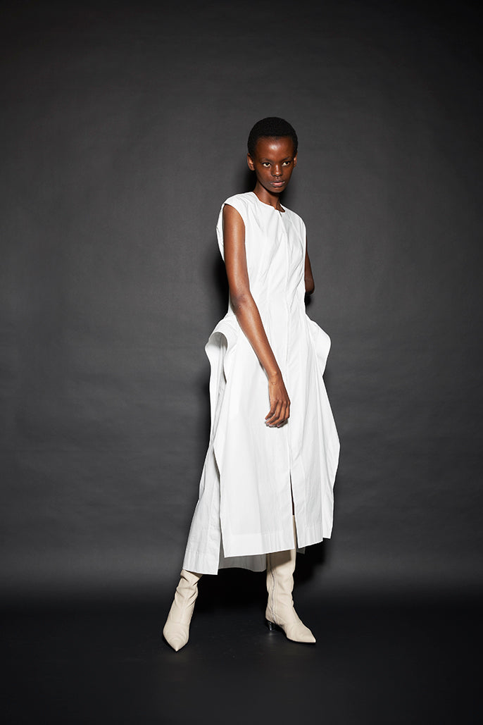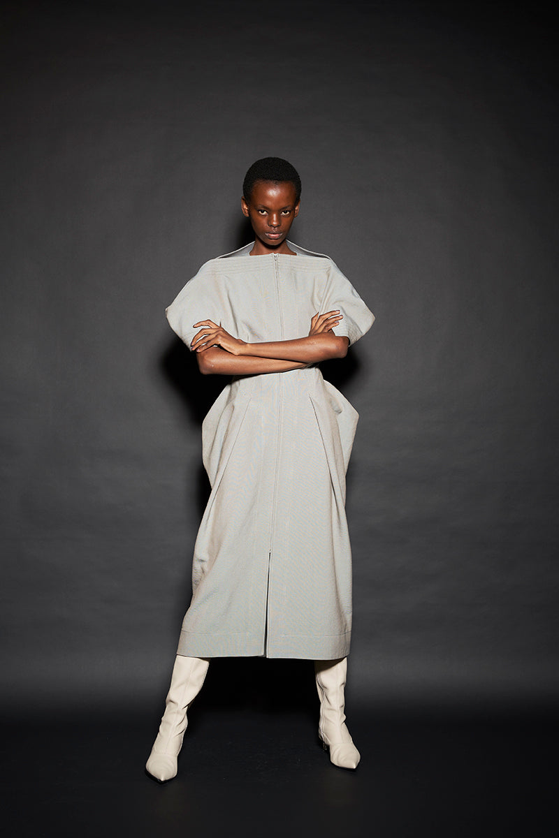 このようにして制作された今回のコレクションは、ドレーピングによってシルエットを作り出すといった典型的なdivkaの服と比較すると、より彫刻的な、よりメリハリのあるシルエットの服が多くラインナップされることになりました。これらの服の形態における特徴は、これまでのdivkaらしさの枠組みには収まりきらないものでした。