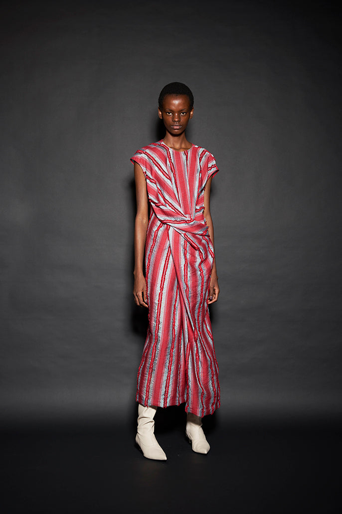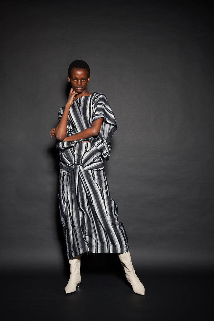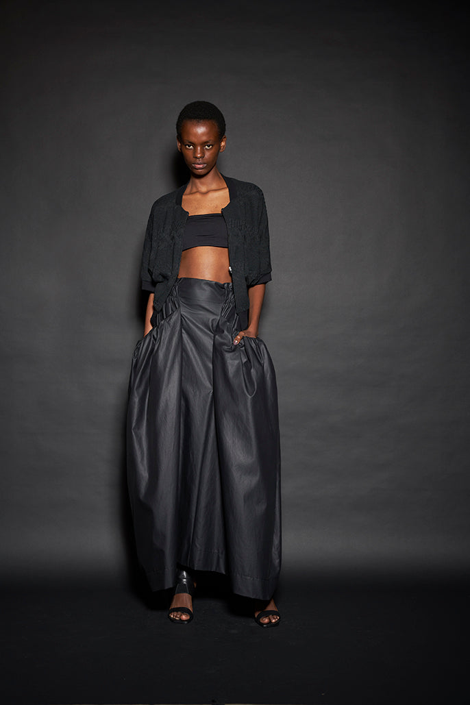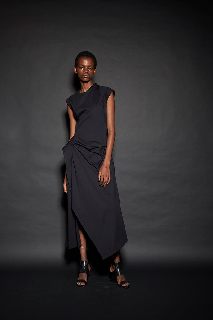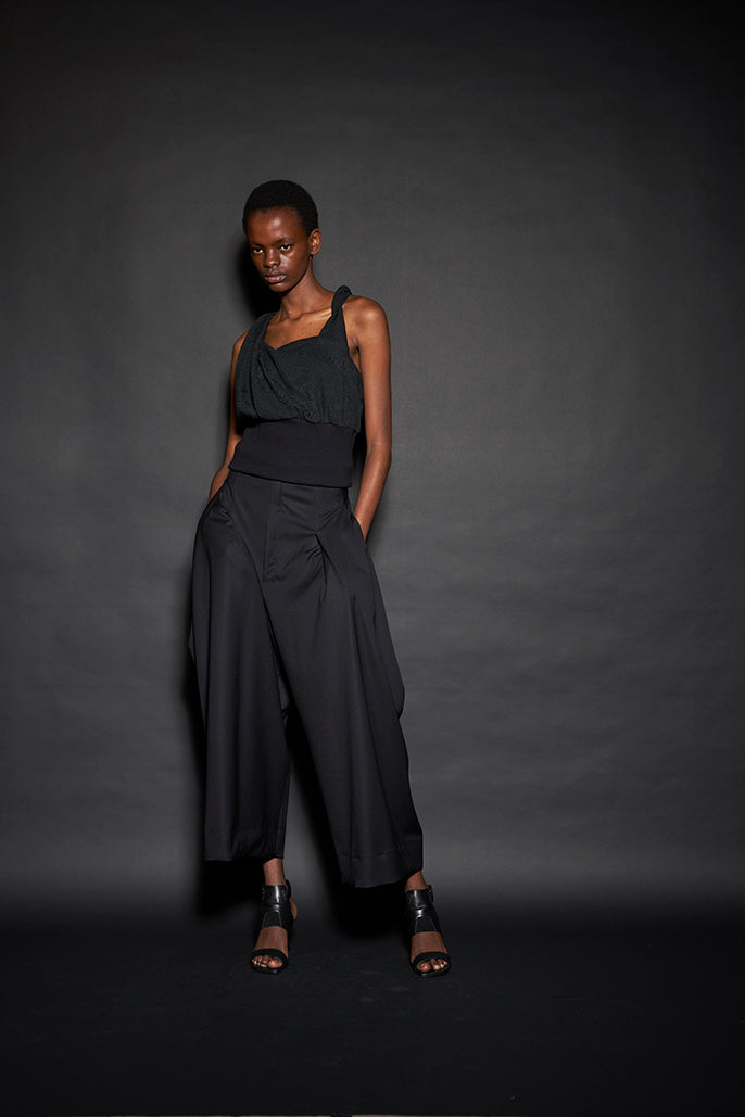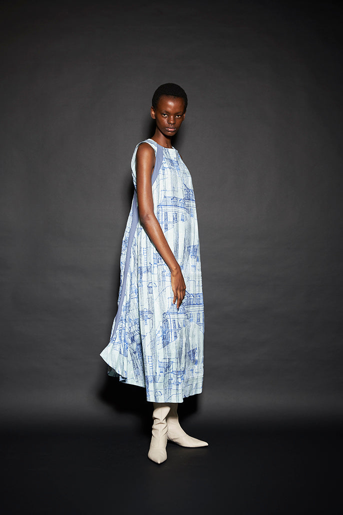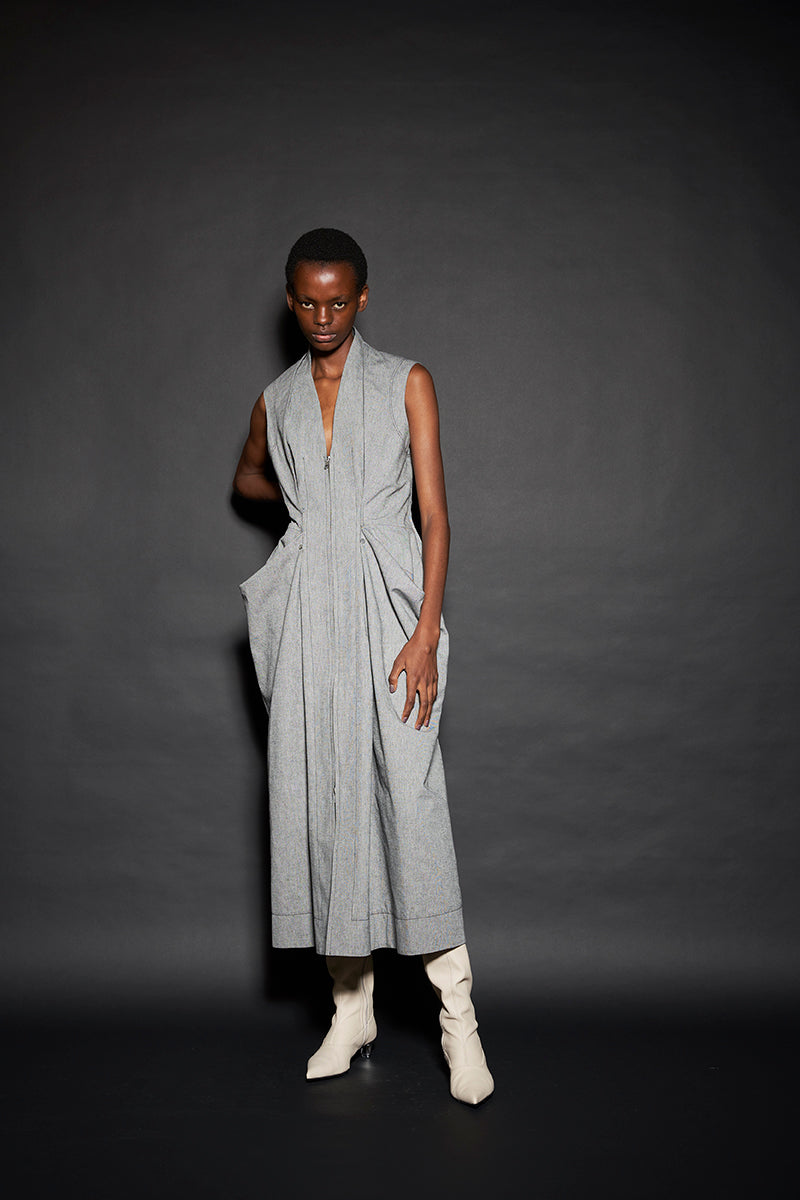 このようにして制作された今回のコレクションは、ドレーピングによってシルエットを作り出すといった典型的なdivkaの服と比較すると、より彫刻的な、よりメリハリのあるシルエットの服が多くラインナップされることになりました。これらの服の形態における特徴は、これまでのdivkaらしさの枠組みには収まりきらないものでした。