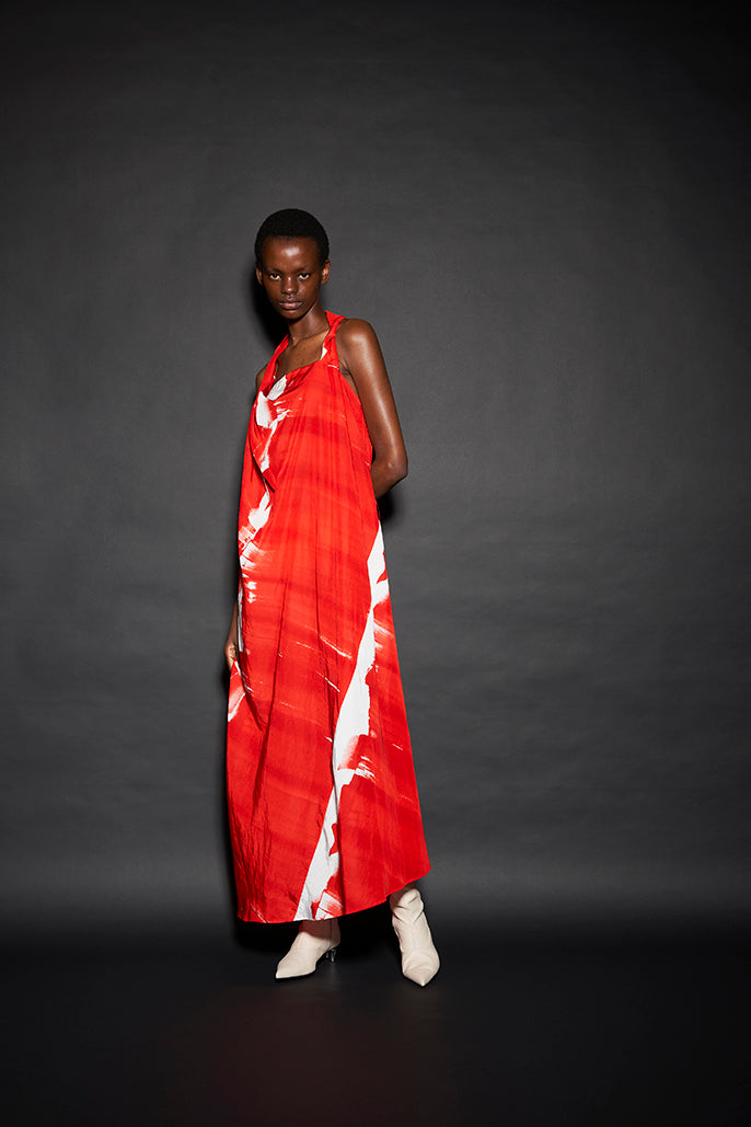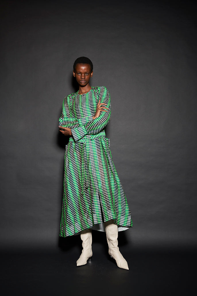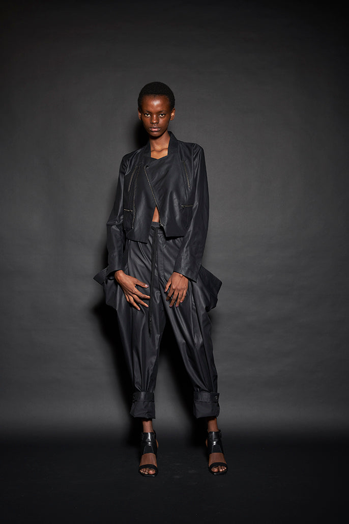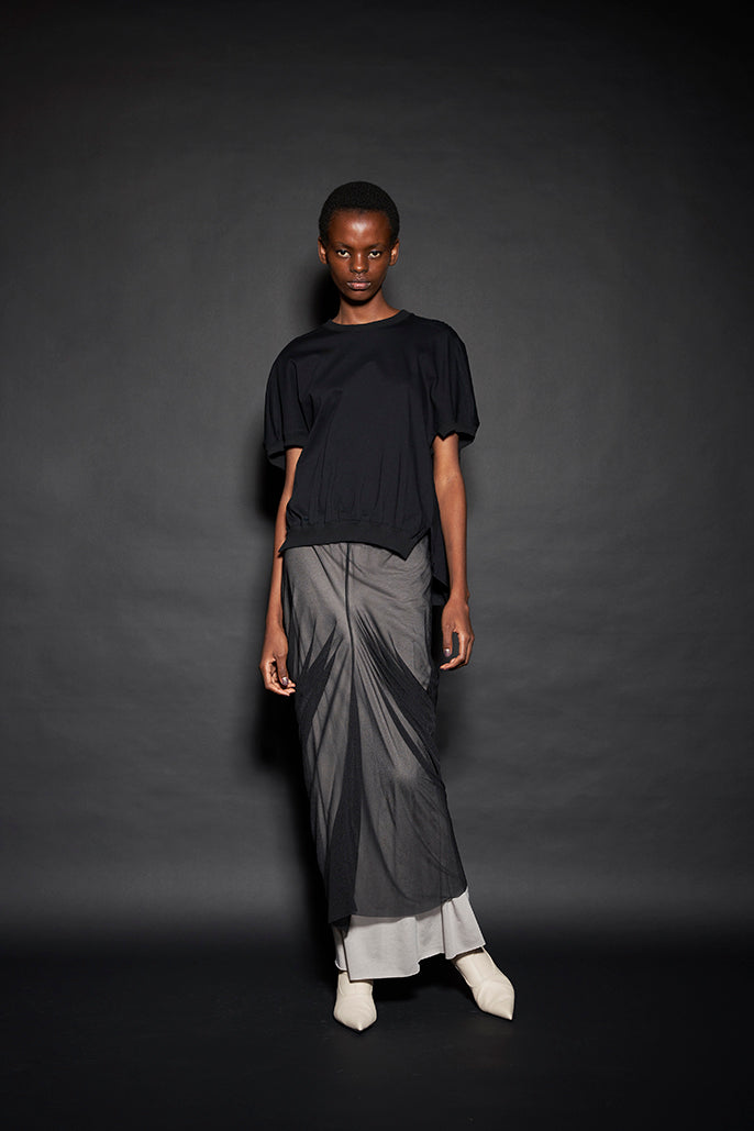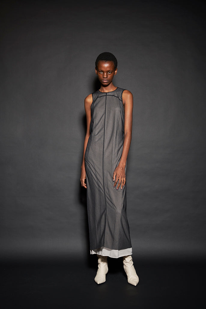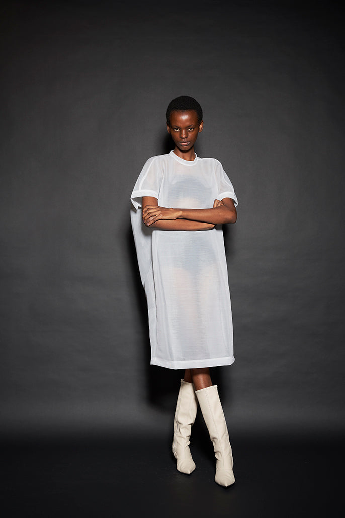 このようにして制作された今回のコレクションは、ドレーピングによってシルエットを作り出すといった典型的なdivkaの服と比較すると、より彫刻的な、よりメリハリのあるシルエットの服が多くラインナップされることになりました。これらの服の形態における特徴は、これまでのdivkaらしさの枠組みには収まりきらないものでした。