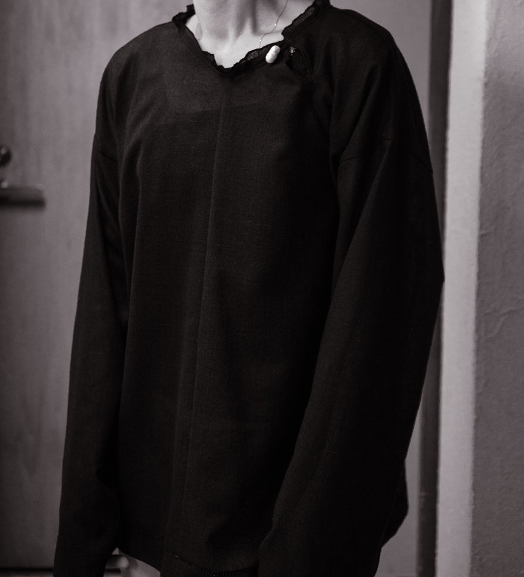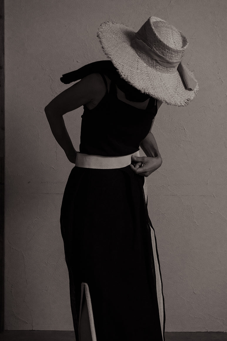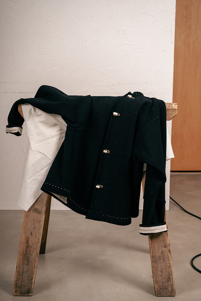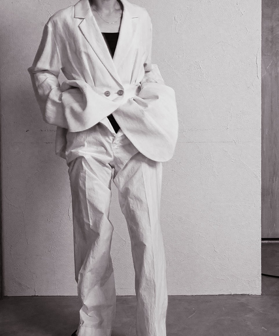 運命の絆を象徴とした、天然の双子パールをボタンやギャザーの窪みにあしらったコレクション。人と洋服の出会いや着る人と人の出会いの衝動性や運命を後押しする、人間界ではいびつとされる一つ一つ個性のある美しさを持つ双子パールは、奇跡的に貝の中で二つが結びついたもの。ハンドワークで仕上げた完璧でないいびつさを残すコレクションとシナジーが生まれる。