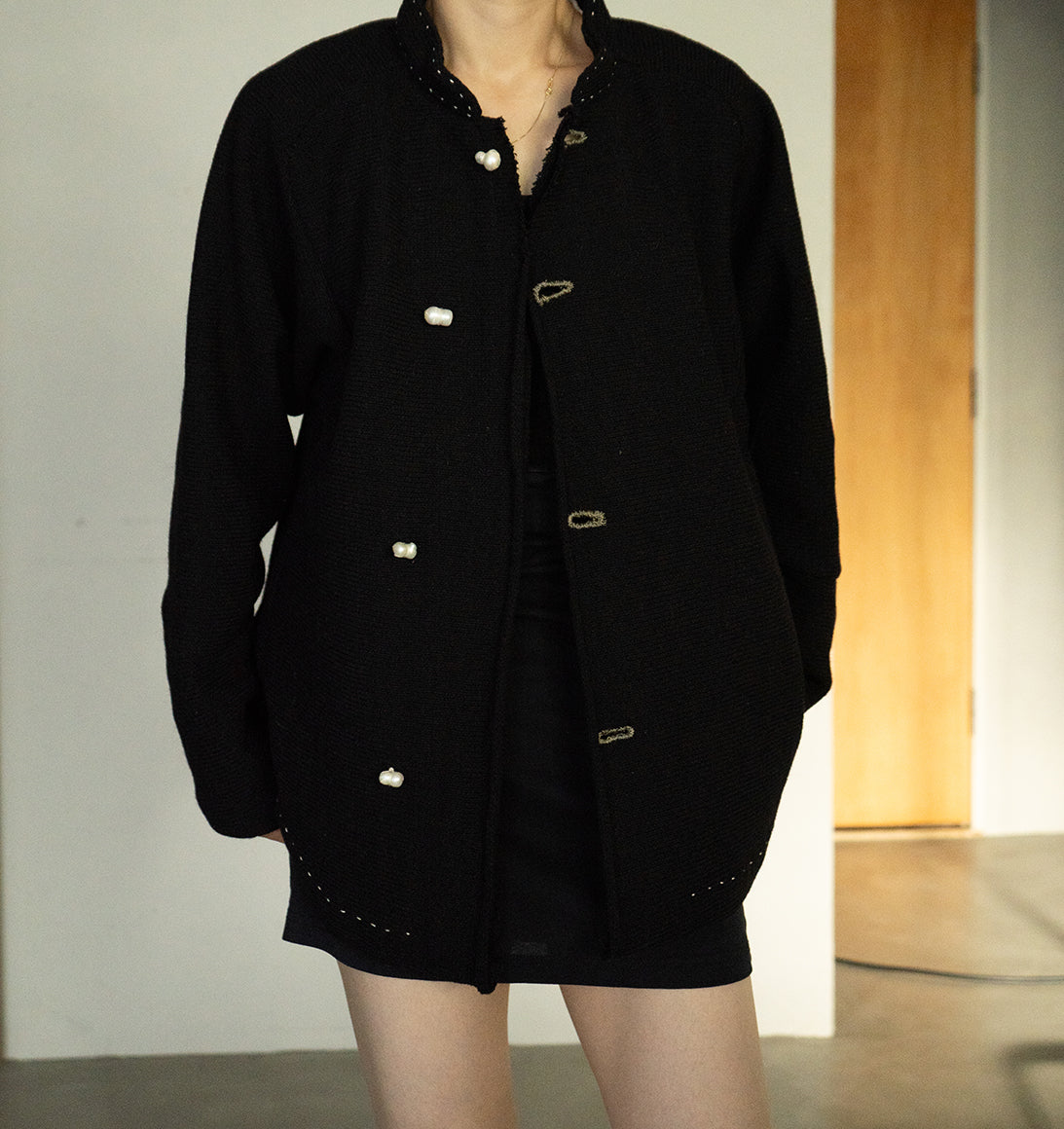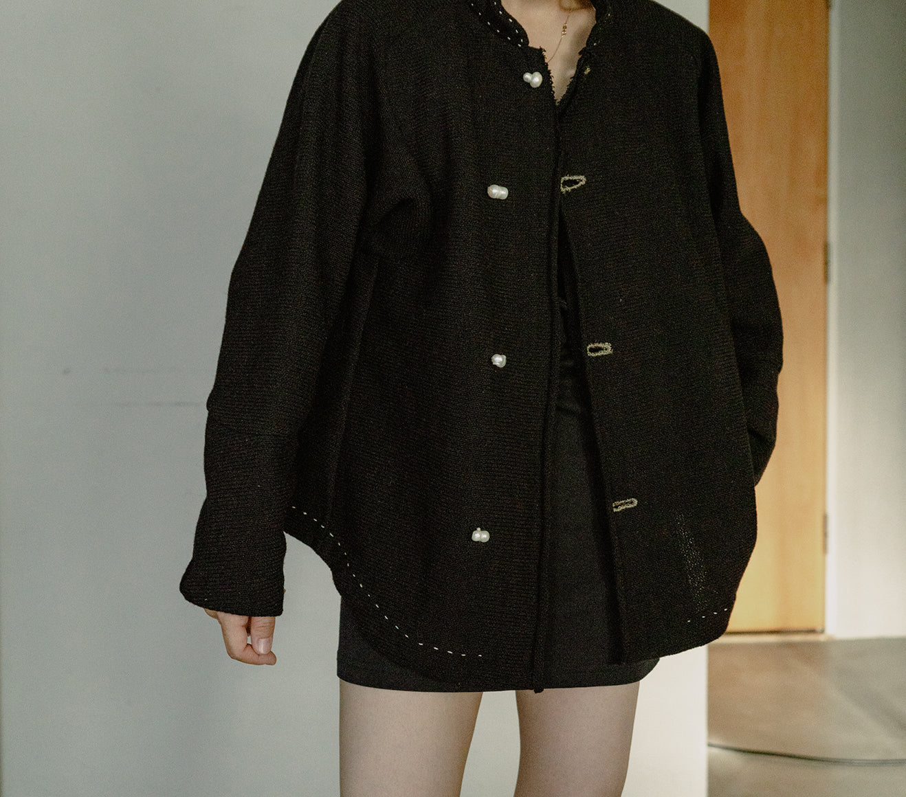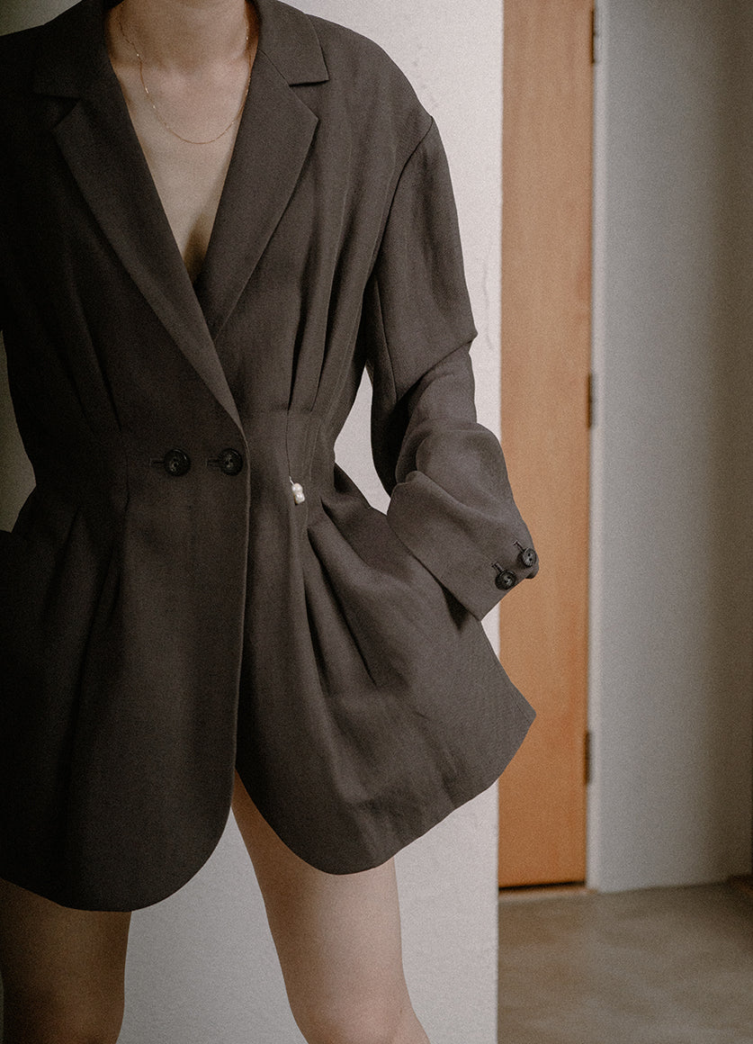 運命の絆を象徴とした、天然の双子パールをボタンやギャザーの窪みにあしらったコレクション。人と洋服の出会いや着る人と人の出会いの衝動性や運命を後押しする、人間界ではいびつとされる一つ一つ個性のある美しさを持つ双子パールは、奇跡的に貝の中で二つが結びついたもの。ハンドワークで仕上げた完璧でないいびつさを残すコレクションとシナジーが生まれる。