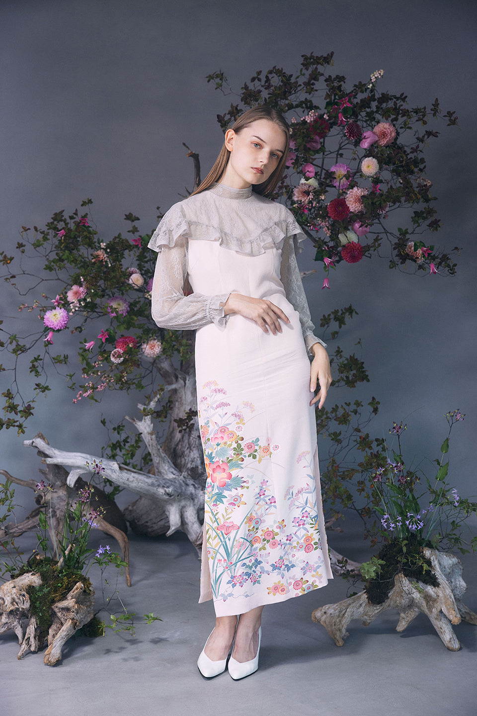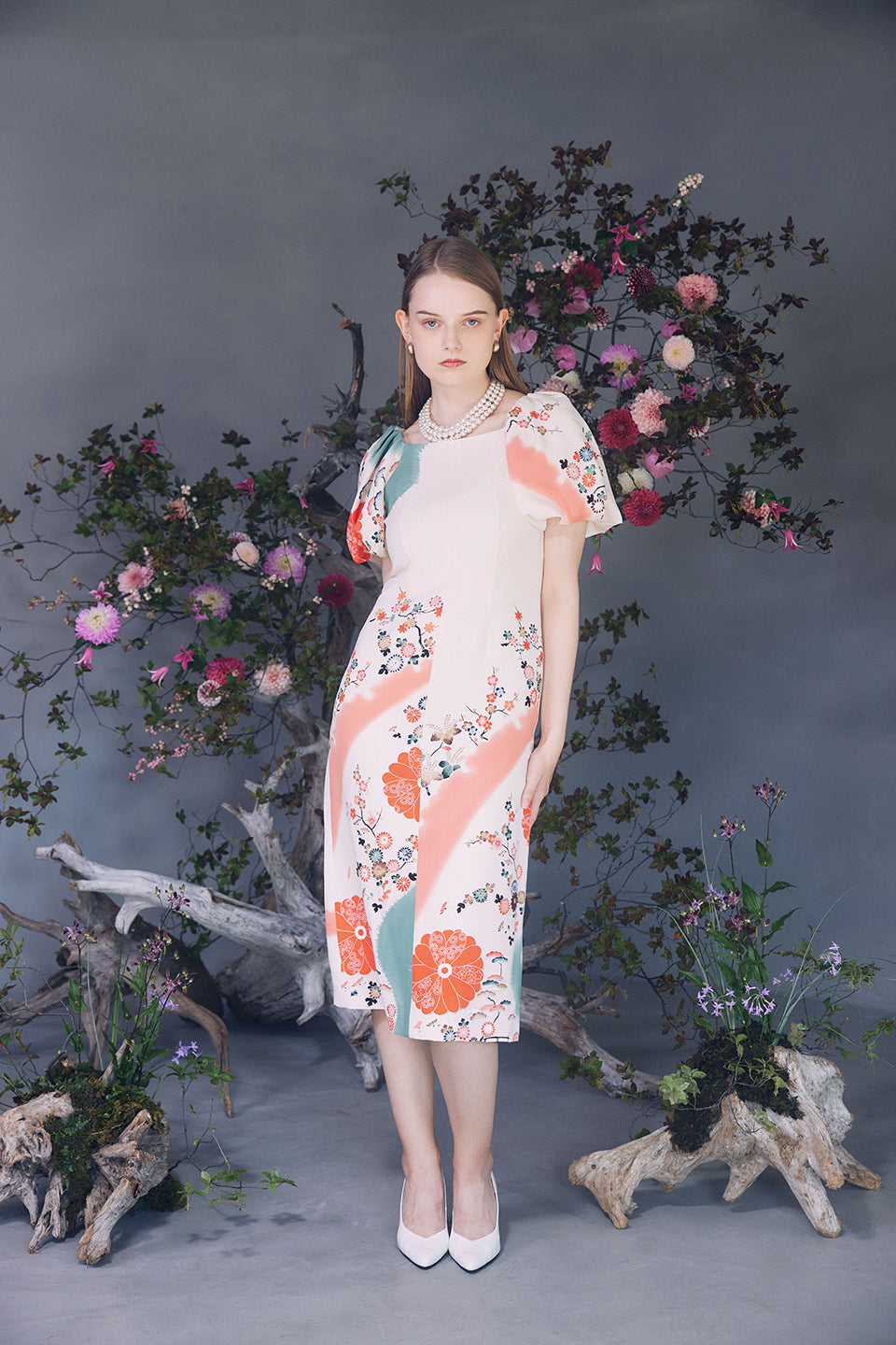 反物と呼ばれる⻑い布地をまっすぐに裁って作られる着物は、仕⽴てた後も⽷を解けば⼀枚の布に戻り、新たな⽤途に活⽤できるのが特徴。そんなエシカルファッションの先駆けとも⾔える⽇本の着物の知恵を活かして作られた本コレクションは、使⽤しなくなった着物⽣地を廃棄することなくリメイクすることでファッションの持続可能性を⾼めるアップサイクルな取り組みです。